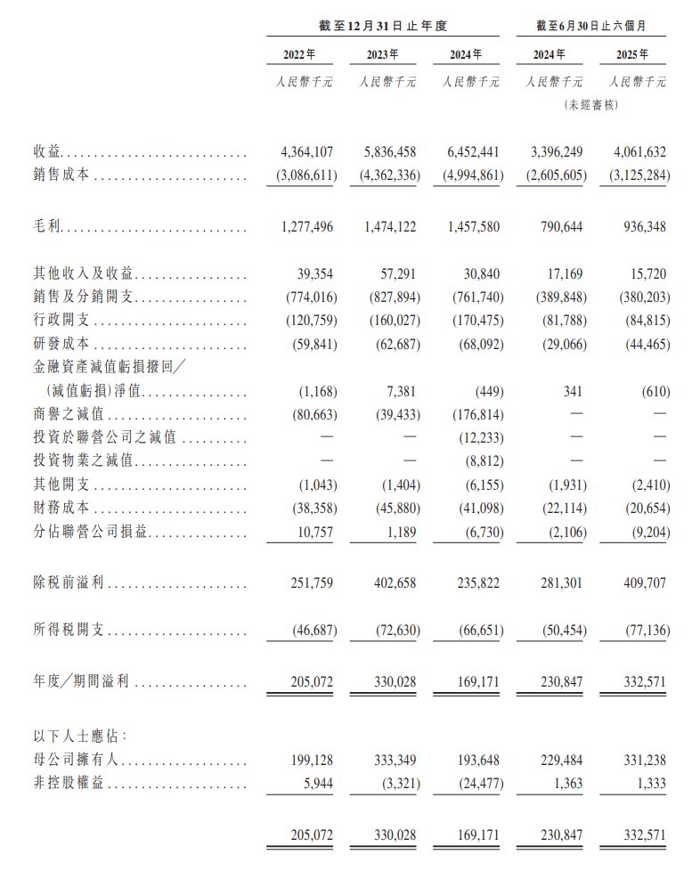 财务方面,于2022年度、2023年度、2024年度及2025年截至6月30日止六个月,潮宏基实现收入分别约为43.64亿元、58.36亿元、64.52亿元、40.62亿元人民币;溢利分别为2.05亿元、3.30亿元、1.69亿元、3.33亿元人民币。